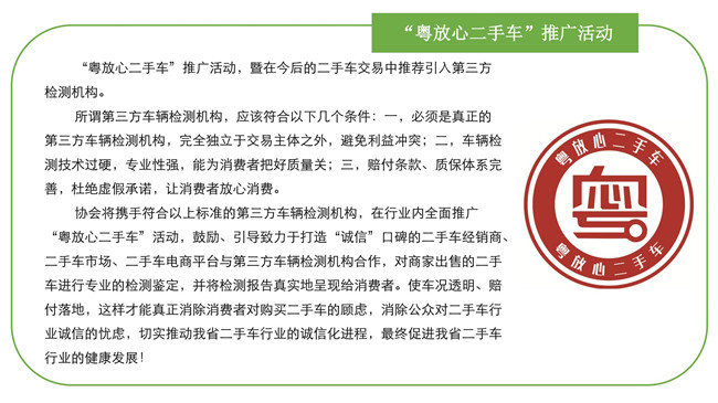 由于二手车一车一况一价的特殊性,二手车交易中的信息不对称一直严重影响着行业诚信的建设。为了让二手车交易信息透明起来,继续打造二手车行业“诚信”形象,协会将举办“粤放心二手车”推广活动。