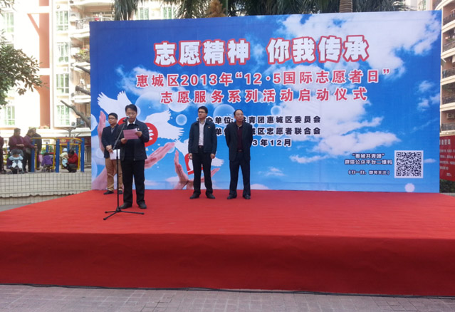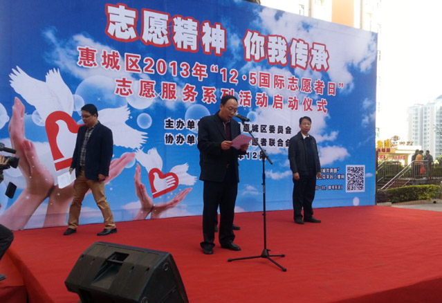 为宣扬和传承志愿服务精神,引导广大群众参与志愿服务活动,共青团惠城区委员会、区志愿者联合会将举办“志愿精神 你我传承”——惠城区2013年“12•5国际志愿者日”志愿服务系列活动启动仪式。